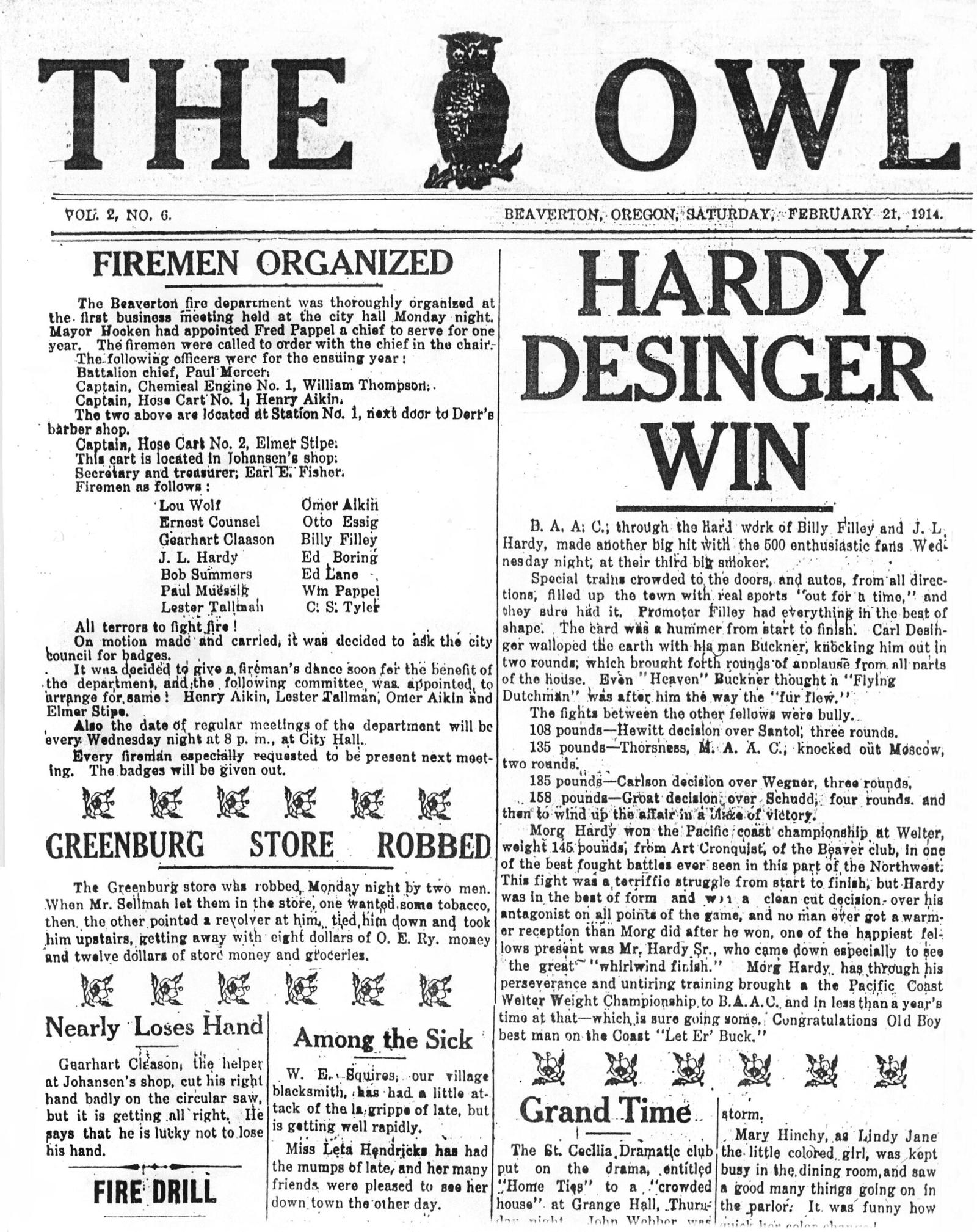 🢡 1914 “The Owl” was the first documentation of Beaverton organizing a volunteer fire department.