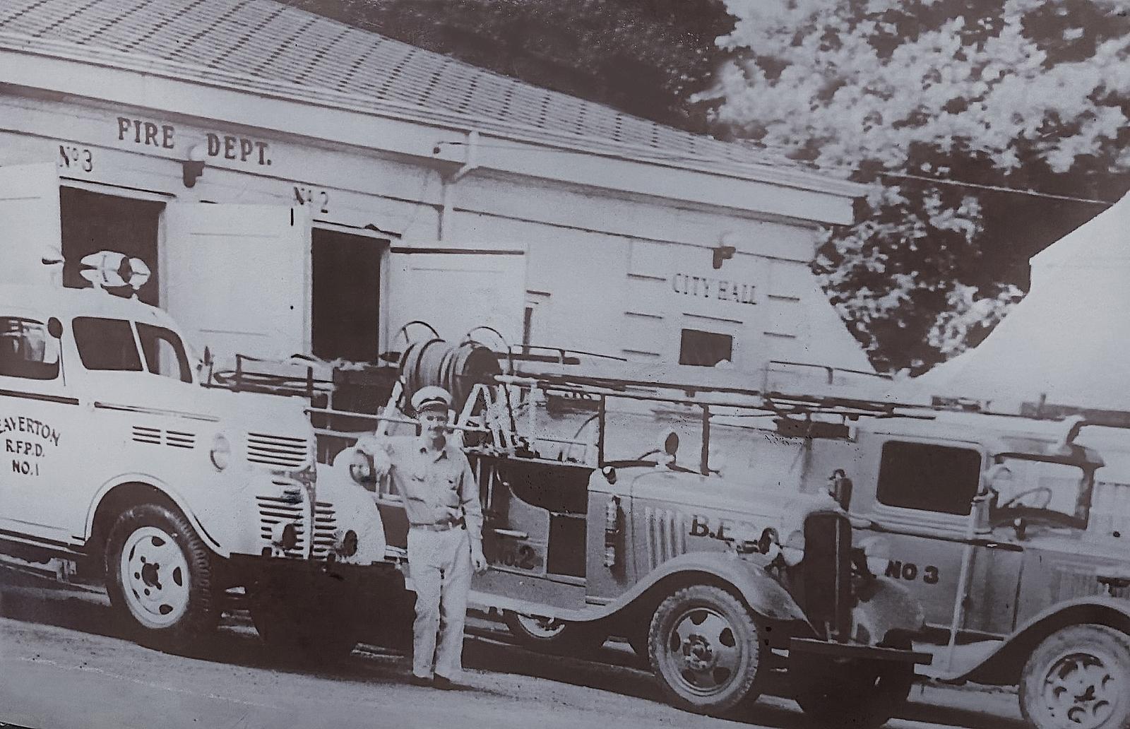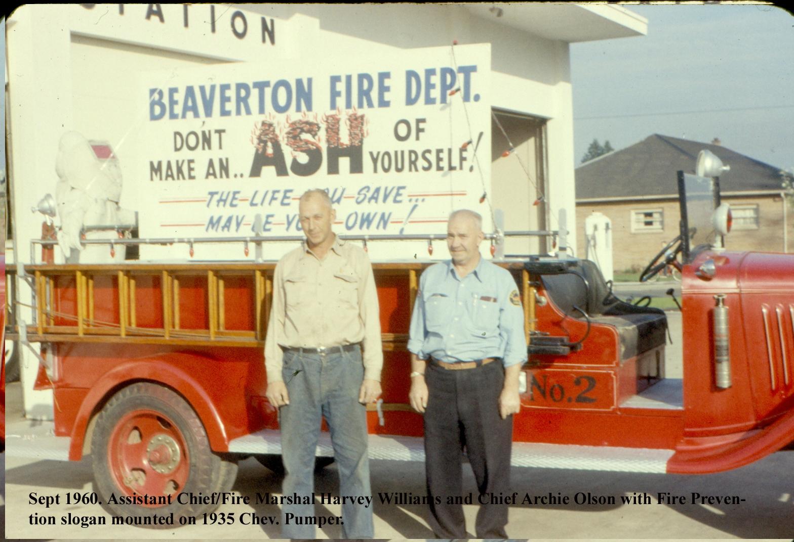 🢡 1946 Beaverton Rural Fire Protection District is established. Chief Archie Olson stands in front of the First Street Fire Station with the Beaverton Rural Engine No. 1, Beaverton Fire Department Engine No. 2 (1935 Chevy) and Tanker No. 3 (1928 Graham Truck with a 600 gallon water tank).