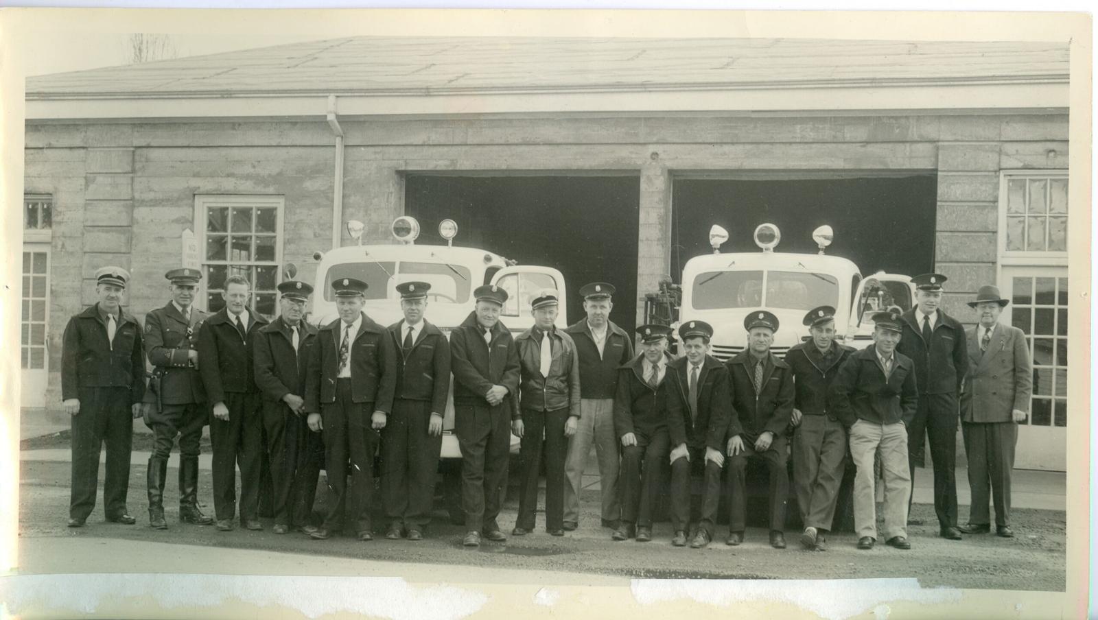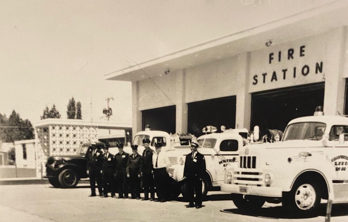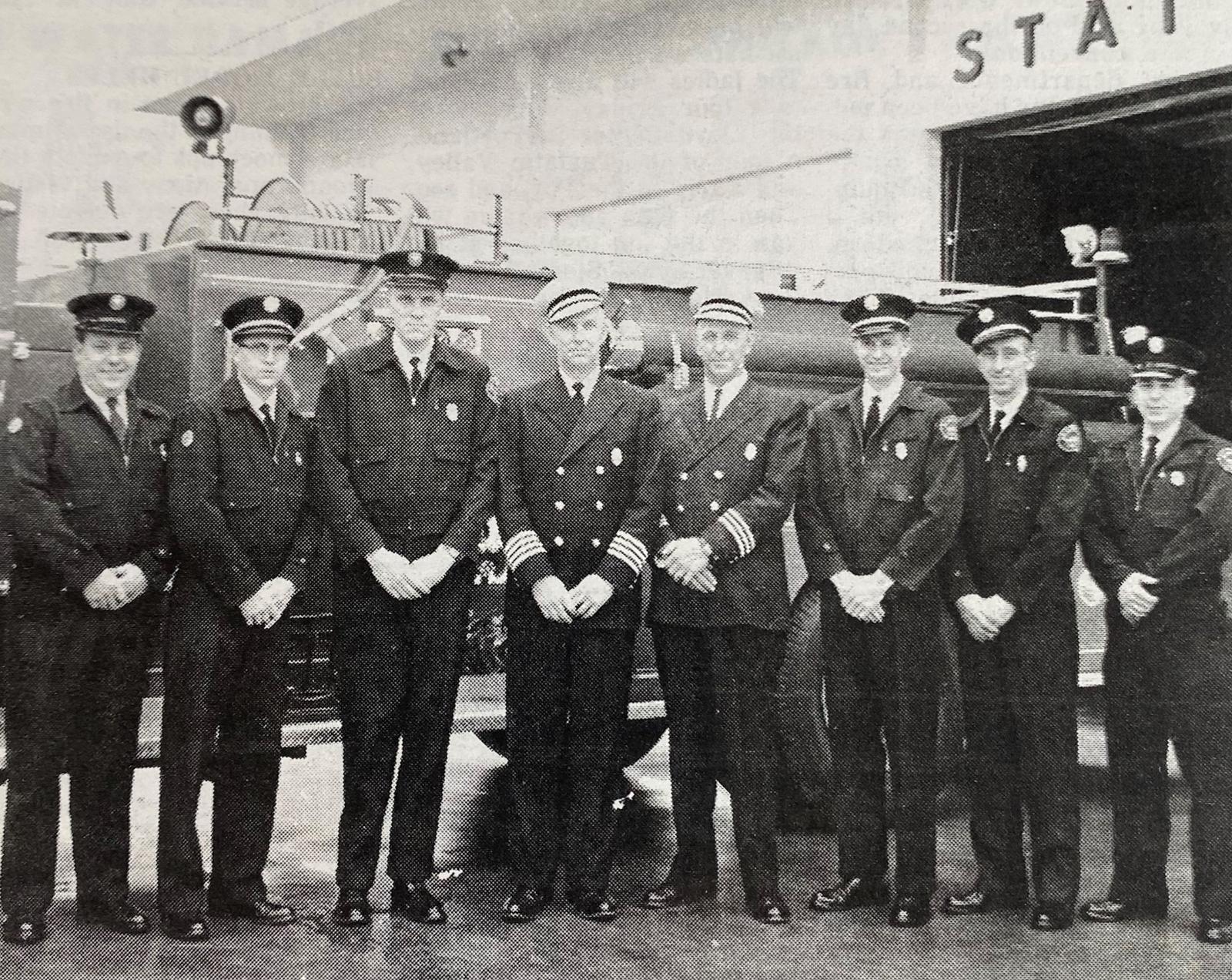 🢡 1963 Paid personnel from left include: Engineer Bob Lambert, Captain Dick Classen, Engineer Frank Pohs, Chief Bob Wickam, Assistant Chief/Fire Marshal Harvey Williams, Captain Jim St. Clair, Captain Ernie Metcalf and Engineer Russ Stuve.