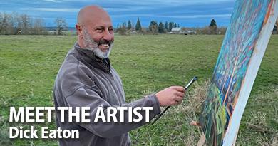 His work is primarily of the Plein Air style (French meaning “outdoors”) which was popularized in the 19th Century and focuses on open air, outdoor subjects painted in the outdoors. Often they feature gorgeous, sweeping landscapes that transport you to another place. Far more challenging in many ways than studio work, Plein Air requires dedication to a communal relationship with nature. Weather, wildlife, quick-drying acrylic paints, and an ever-changing source of light provide constant hurdles to contend with, but Dick welcomes that challenge.