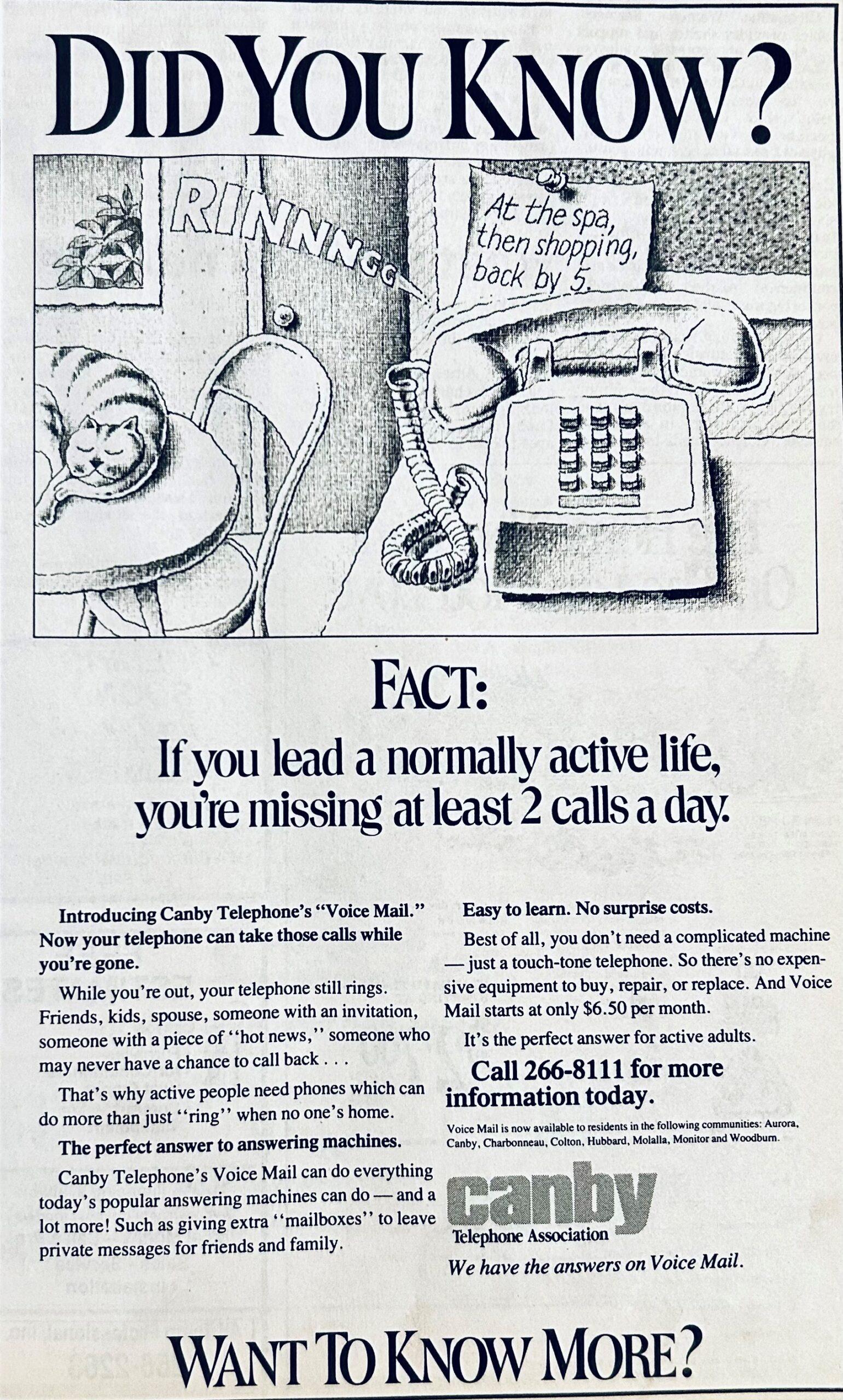 From our collection of Canby Herald newspapers, The Canby Historical Society looks back 35 years to 1989 — a simpler time for many that consisted of long evenings on the porch, hanging out at bonfires, reading the paper and kids playing outside. The Canby Telephone Company was just introducing “Voice Mail” for its customers. It’s crazy to think in just a few years people would be consumed by the WWW (World Wide Web), AOL and dial-up services. Of course, this era had its own distractions with TV, picking a movie from Blockbuster and Nintendo!