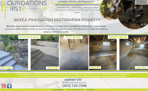 Foundations First Northwest is located at 28655 SW Boones Ferry Rd. in Wilsonville. Give them a call (503) 610-6268 or visit them online at foundationsfirstnw.com. For employment inquiries, email joe@foundationsfirstnw.com or apply online through their website foundationsfirstnw.com.