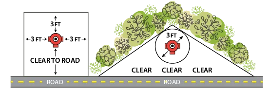 El Departamento de Bomberos de Woodburn sinceramente pide su ayuda continua atraves de mantener “El espacio disponible” de todos los hidrantes contra fuego, FDC’s, o cualquier otro componente relacionado con fuego atraves de remover vegetacion, cercas, material, o cualquier otra obstruccion que no permita visibilidad, acceso, o habilidad de trabajar alrededor del material relacionado con el fuego. Abajo estan unos ejemplos visuales (diagramas/fotos) que reflejan visibilidad, espacio, y acceso hacia y alrededor del hidrante contra fuego y FDC’s: