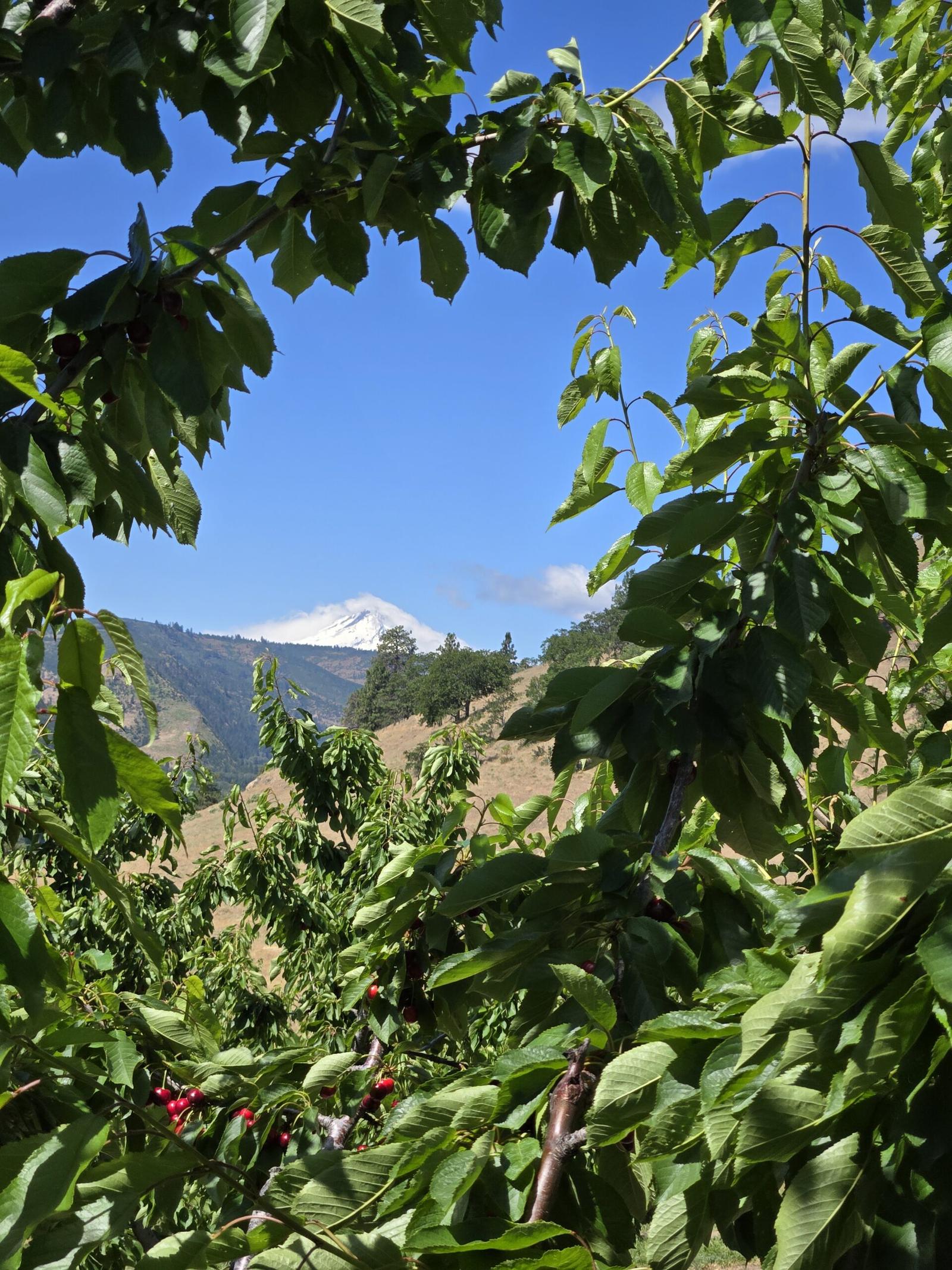 Visitors to the farmstand can shop for an assortment of USDA pork and beef, fresh vegetables grown right on the farm, and seasonal fruits, including the sweet cherries they’re most famous for. A cozy enclosure with heating and air conditioning, the stand features a walk-in cooler, a display freezer and a certified kitchen. “We developed the kitchen so we could process our fruits and vegetables and give the community access to good, local foods even in the wintertime,” Mary says. Offerings include jams, jellies, pickled and preserved fruits and vegetables, and sweet and savory pies. Summer hours are Thursday through Sunday, 11 am to 4 pm, Fridays and Saturdays only during the winter. The family attends The Dalles Farmers Market when it’s in season and brings a similar sampling to share.