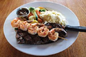 The restaurant is famous for its halibut and cod fish and chips and an impressive choice of surf and turf featuring beautiful cuts of grass-fed beef like ribeye blue and filet mignon, and fresh, succulent seafood options like halibut creole, grilled prawn skewers, and salmon stuffed with feta cheese, crab and bay shrimp. The chef is passionate about using the best quality products available. And don’t forget about dessert! Finish your meal with a slice of rich and creamy cheesecake made fresh by Beloved Cheesecakes in Silverton.