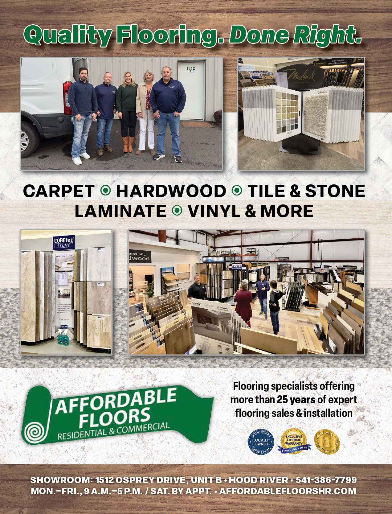 A local Hood River business since 1992, Affordable Floors teamed up in 2002 with Abbey Carpet & Floors to expand their purchasing power nationwide. After 25 years of operation on 13th Street, the business moved to its current location on Osprey Drive which provided ample space to build a new luxury showroom. “Everybody who walks in is just in awe of the showroom,” says owner Larry Williams. “It’s eye-popping.” Supplying both residential and commercial flooring, Affordable Floors Abbey Carpet offers customers the best and largest selection of carpet, hardwood, laminate, vinyl and tile in a friendly, comfortable and helpful atmosphere. “Come see the latest and newest in floor covering designs,” says Larry, noting that there’s always something new coming in.
