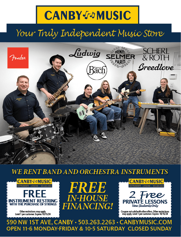 Canby Music offers a wide variety of instruments for rent and sale, along with experienced, caring instructors. The store also offers a full array of repair and maintenance services. Canby Music is located at 590 NW 1st Ave. For more information, visit canbymusic.com or call 503-263-2263.