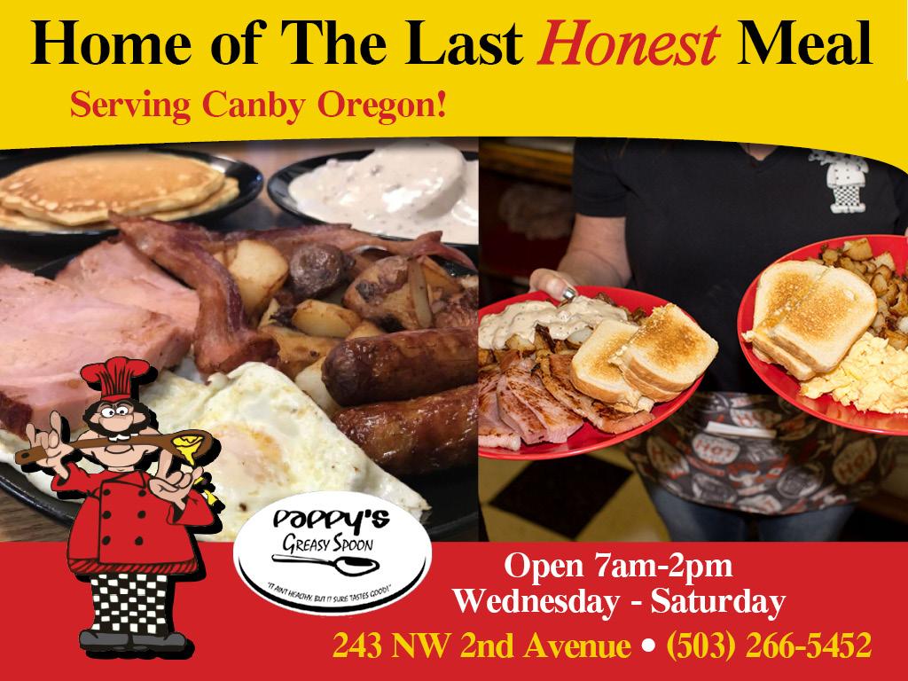 Support local businesses and find a new favorite “greasy spoon!” Pappy’s Greasy Spoon is located at 243 NW 2nd Avenue in Canby. Give them a call at (503)266-5452.